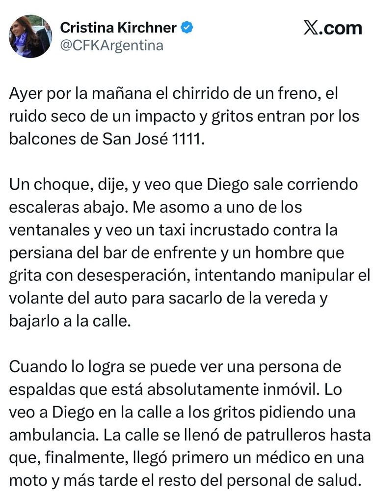 Luego, desde su departamento la expresidenta pudo ver a una persona de espaldas “absolutamente inmóvil”. Al ver a uno de sus custodios, Diego Carbone, pidiendo una ambulancia a los gritos, “la calle se llenó de patrulleros hasta que, finalmente, llegó primero un médico en una moto y más tarde el resto del personal de salud”.
