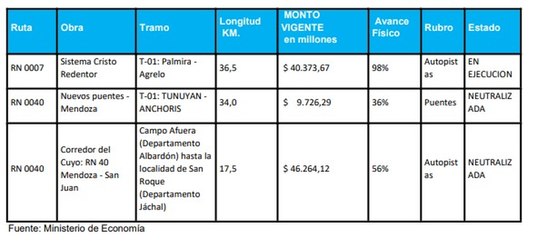 Según el informe de gestión nacional del jefe de Gabinete de Ministros, Guillermo Francos, que entregó al Congreso de la Nación este miércoles, las obras están "neutralizadas" y no tienen avances (ver imagen abajo). Sin embargo, desde Vialidad Nacional desmintieron al propio informe y señalaron que los trabajos siguen en progreso, aunque con mayor lentitud.