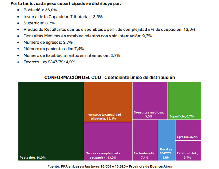 Para entender por qué hay municipios que ganan o pierden en la distribución del CUD, hay que mirar los hospitales municipales, ya que el 37,1% del CUD se define por la producción en salud (camas ocupadas, consultas y egresos), un indicador que suele ser objeto de auditorías cruzadas. Y el resto del índice se reparte entre población (36%), la inversa de la capacidad tributaria (13,3%) —que busca compensar a los distritos más pobres— y la superficie territorial (8,7%).