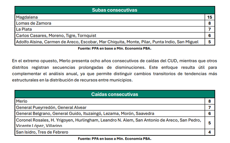 El reparto del CUD dejo ganadores y perdedores. Entre los ganadores se encuentran principalmente municipios del interior bonaerense como: Chacabuco, encabeza la lista con un incremento del 15,68%, seguido por Campana (+12,50%), Capitán Sarmiento (+10,62%) y Exaltación de la Cruz (+10,55%). Estos distritos capitalizaron mejoras en sus indicadores de servicios básicos y producción sanitaria, motores principales del cálculo.