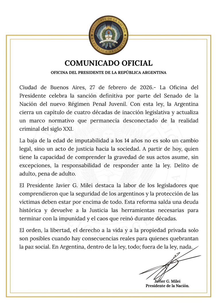 Mediante un comunicado publicado en X, el Ejecutivo expresó: “La Oficina del Presidente celebra la sanción definitiva por parte del Senado de la Nación del nuevo Régimen Penal Juvenil. Con esta ley, la Argentina cierra un capítulo de cuatro décadas de inacción legislativa y actualiza un marco normativo que permanecía desconectado de la realidad criminal del siglo XXI”.