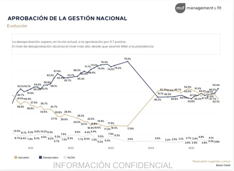 El sondeo de Management & Fit marca un 53,6% de desaprobación para Milei, con la corrupción como principal problema del país.