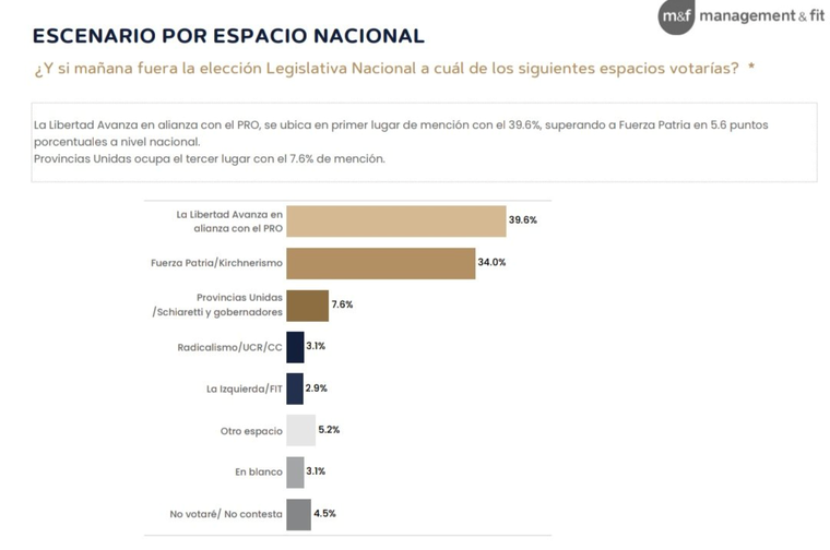 El humor social se traslada a las urnas. De cara a las legislativas, La Libertad Avanza en alianza con el PRO encabeza la intención de voto a nivel nacional con 39,6%, aunque con apenas 5,6 puntos de ventaja sobre Fuerza Patria. En la provincia de Buenos Aires, sin embargo, el escenario se invierte: allí el peronismo unido se impone con el 40% frente al 31,9% de la alianza oficialista.