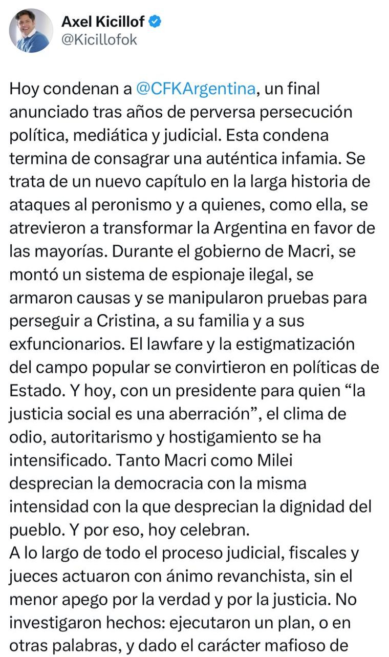 El mandatario se sumó a la ola de repudios luego de acudir esta misma tarde a la sede del PJ, donde CFK aguardaba el fallo judicial. Pese a meses de rispideces internas, Kicillof no dudó en denunciar que la condena es “un final anunciado tras años de perversa persecución política, mediática y judicial”.
