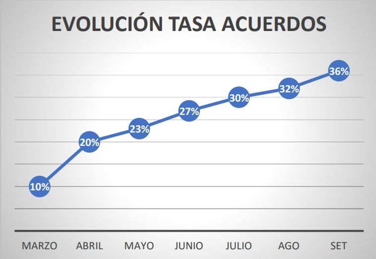 La Subsecretaría de Justicia realizó un análisis del desempeño de la Oficina de Conciliación Civil y Comercial desde su puesta en funcionamiento y advirtió una evolución en la tasa de acuerdos. Mientras que en marzo era del 10%, en septiembre los acuerdos alcanzados ya representan el 36% de las audiencias que se tramitan en esta nueva dependencia.