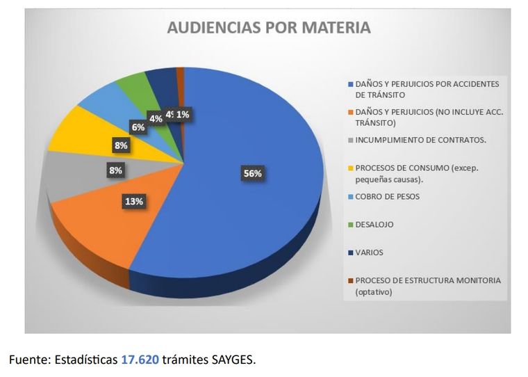 La gran mayoría de los casos analizados por esta oficina fueron por daños y perjuicios por accidentes de tránsito. El 56% de las audiencias realizadas entre el 10 de febrero y el 30 de septiembre fueron por estos hechos. Mientras que el porcentaje de casos de daños y perjuicios no vinculados a incidentes viales representaron el 13%.