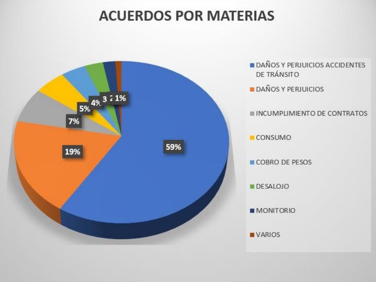 El 59% de los acuerdos fueron por casos de daños y perjuicios por accidentes de tránsito. En atento, el 19% fue por daños y perjuicios no vinculados a incidentes viales. El 7% fue por incumplimiento de contratos, el 5% por consumo, el 4% por cobro de pesos y el 3% por desalojo.