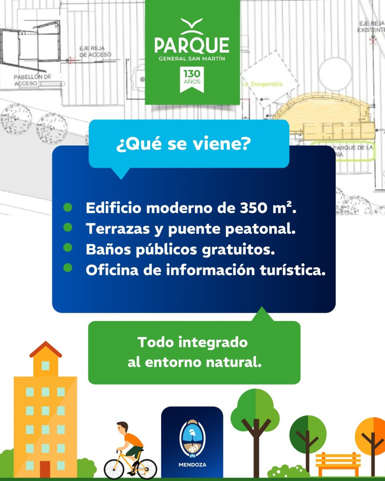 La intervención también incluye una plaza de acceso de aproximadamente 1.000 m², nuevas terrazas y puentes peatonales que suman cerca de 400 m², y la reconstrucción de unos 600 m² de senderos en teja molida, material característico del Parque General San Martín, respetando su identidad histórica y paisajística.