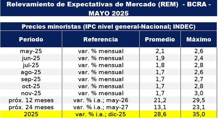 Por un lado, el Relevamiento de Expectativas de Mercado (REM), que proyectó que mayo tendrá una inflación del 2,1%, junio del 1,9%, julio del 1,8%; y para agosto, septiembre, octubre y noviembre, rondará el 1,7%. Todos los meses, por encima del 1,2% ofrecido.