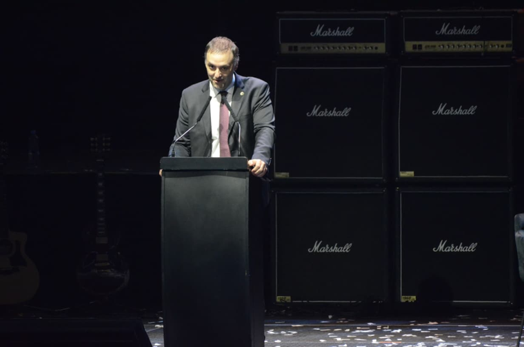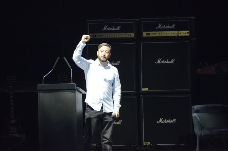 El Presidente regresó al escenario para la presentación de su nuevo libro, después de interpretar el himno nacional, a capela.