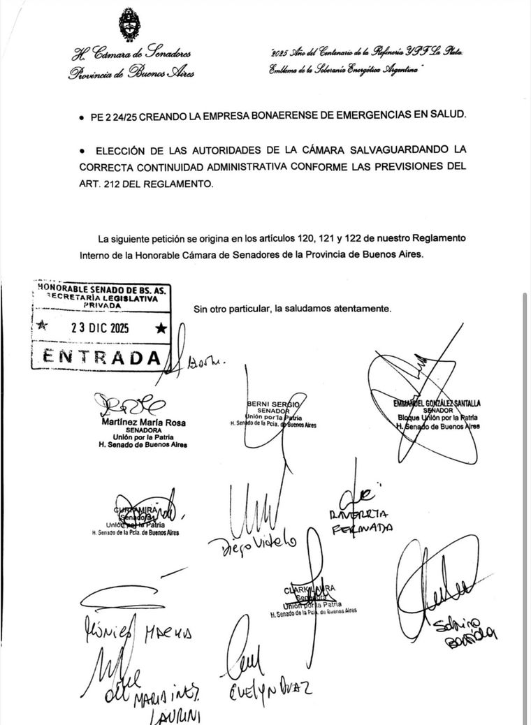 Una nueva bomba de implosión explotó en el seno de Fuerza Patria en el transcurso de la mañana del martes. Más de una decena de senadores provinciales, que responden a La Cámpora, le pidieron a la vicegobernadora de Axel Kicillof, Verónica Magario, que convoque a una sesión especial para el 29 de diciembre porque sino lo hiciese caería la posibilidad de crear el sistema de emergencia provincial y el Centro de Industria Farmacéutica, ambas con estado parlamentario.