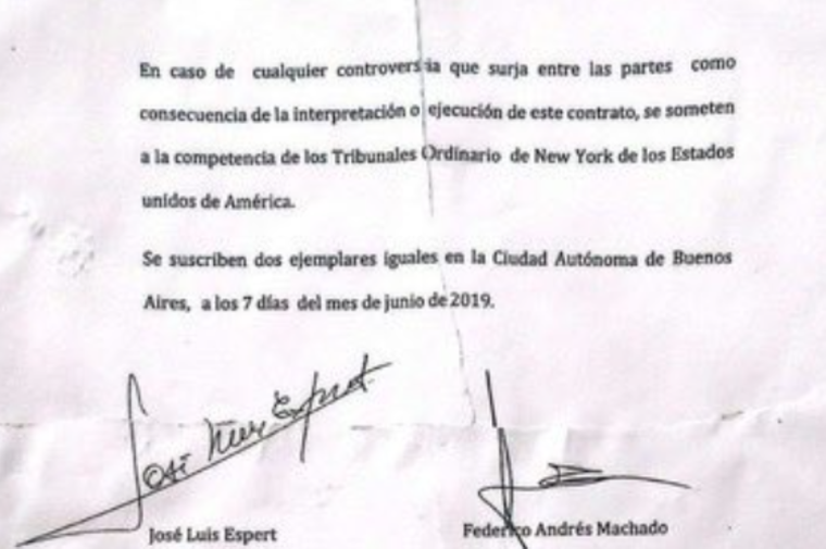 La suma total del contrato es por un total de US$ 1.000.000, el monto final en el que se inscribe la transferencia por parte de Federico Fred Machado a Espert de US$ 200.000.