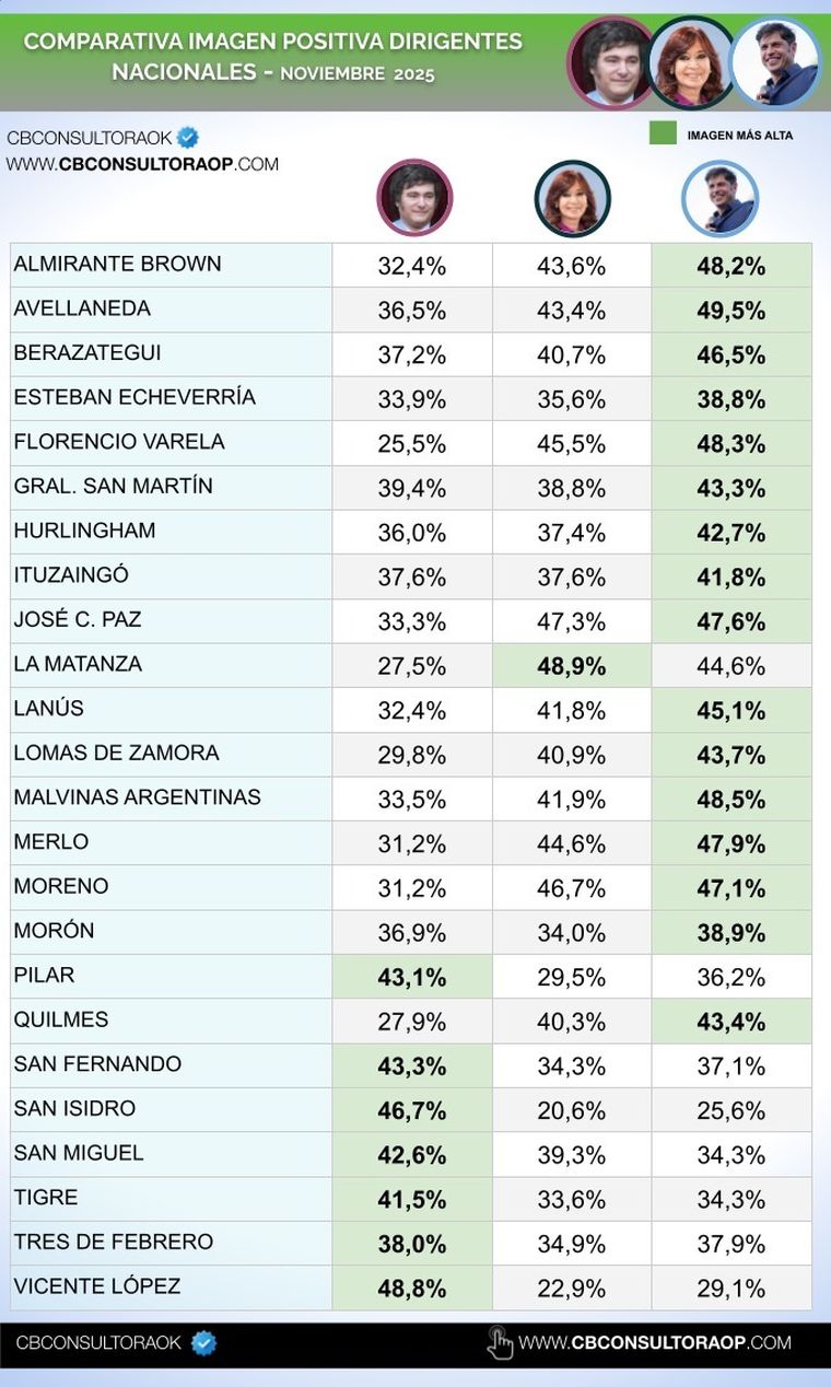 El último relevamiento de CB Consultora correspondiente a noviembre de 2025 muestra un mapa político contrastante en el Gran Buenos Aires respecto de la imagen de los principales dirigentes nacionales: Javier Milei, Cristina Fernández de Kirchner y Axel Kicillof. El estudio, realizado en los 24 municipios más importantes del conurbano, evidencia que los liderazgos se distribuyen de manera dispar según el territorio.