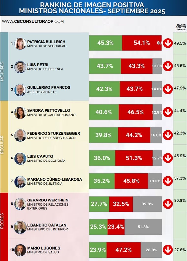 A subes, CB Consultora también analizó la imagen de los integrantes del Gabinete del Gobierno nacional. Los tres ministros nacionales que en septiembre de 2025 poseen mayor imagen positiva entre los ciudadanos son: Patricia Bullrich, ministra de Seguridad, en primer lugar con 45,3%; seguida por Luis Petri, ministro de Defensa, con 43,7%; y en tercer lugar Guillermo Francos, jefe de Gabinete, con 42,3%.
