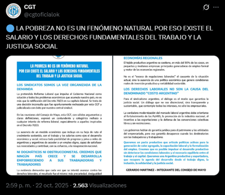 Durante los encuentros del Consejo de Mayo, el secretario general de la UOCRA y representante de la CGT, Gerardo Martínez, reiteró que la central presentó “argumentos sólidos y definiciones claras” en contra de cualquier intento de alterar las leyes laborales vigentes. “La pobreza no es un fenómeno natural: por eso existen los salarios, los derechos del trabajo y la justicia social”, afirmaron los dirigentes.