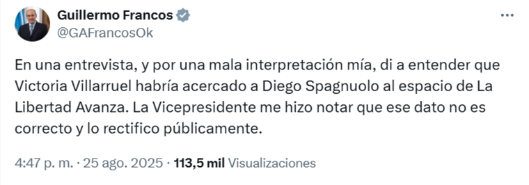 Sin embargo, este lunes el jefe de Gabinete rectificó sus dichos a través de un mensaje en la red social X. “Por una mala interpretación mía, di a entender que Villarruel había acercado a Diego Spagnuolo a La Libertad Avanza. La Vicepresidente me hizo notar que ese dato no es correcto y lo rectifico públicamente”, escribió.