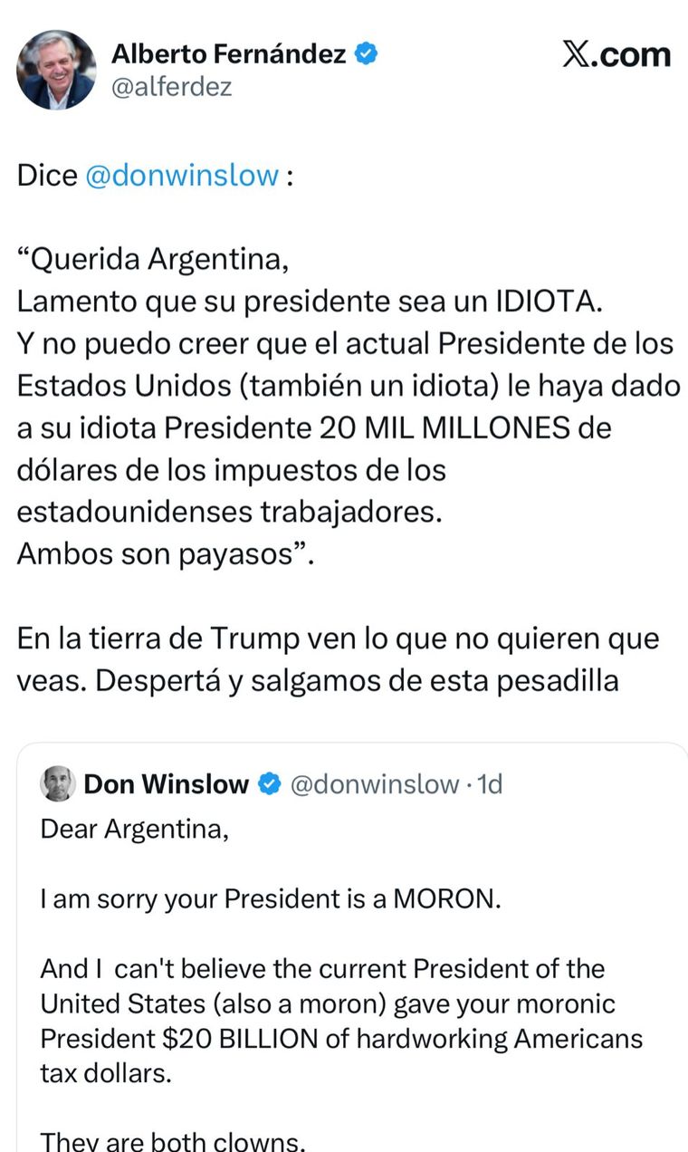 Pese a que durante su presidencia mostró en más de una ocasión pública sus habilidades con la guitarra, tocando canciones de músicos como Lito Nebbia, el exmandatario cargó contra Milei a través de su cuenta de X, donde citó al autor norteamericano "Don Winslow".