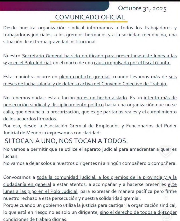 Además, convocaron a toda "la comunidad judicial y a los gremios de la provincia" a las 9.30 para apoyar al gremialista.