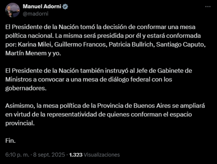 Adorni también comunicó que el Presidente instruyó al jefe de Gabinete, Guillermo Francos, a convocar una mesa de diálogo federal con los gobernadores. “La idea es abrir un espacio de intercambio con las provincias para fortalecer la gobernabilidad y coordinar la agenda nacional”, detalló el vocero en redes sociales.