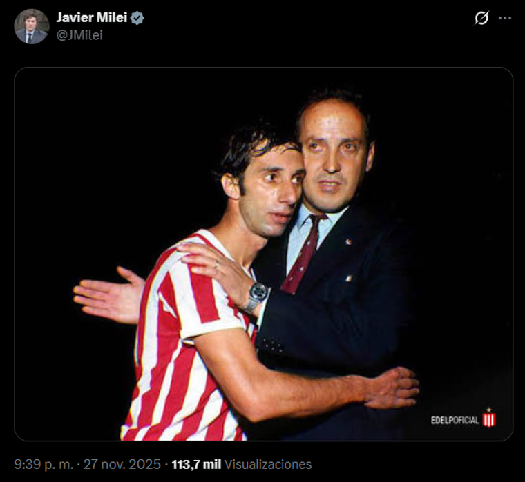 El primer mandatario publicó un sugerente mensaje durante la noche de este jueves. En su perfil de X, la publicación contiene una foto de Carlos Bilardo y Osvaldo Zubeldía. Jugador y técnico, respectivamente, en el mítico Estudiantes de los años 60.