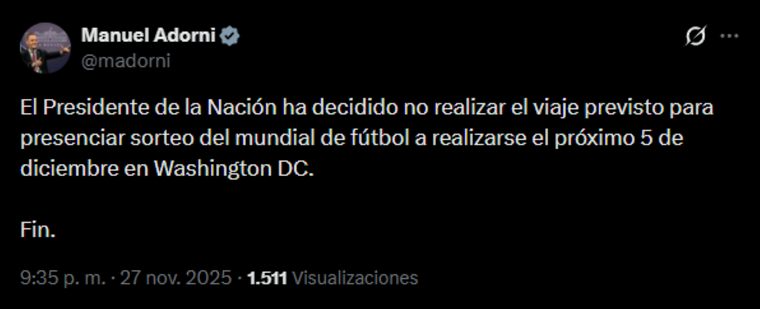 La noticia fue informada por el jefe de Gabinete, Manuel Adorni, a través de su perfil oficial de X: "El Presidente de la Nación ha decidido no realizar el viaje previsto para presenciar sorteo del mundial de fútbol a realizarse el próximo 5 de diciembre en Washington DC. Fin".