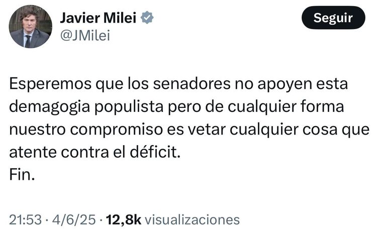 “Esperemos que los senadores no apoyen esta demagogia populista pero de cualquier forma nuestro compromiso es vetar cualquier cosa que atente contra el déficit. Fin”, expresó con furia el libertario en su cuenta de X.