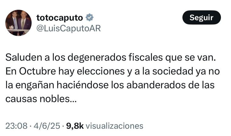 Otro de los integrantes del Gobierno nacional que se pronunció contra el resultado de la votación en el Congreso fue el ministro de Economía, Luis "Toto" Caputo. Con un afilado mensaje en sus redes, también deslizó la idea del veto y se puso en modo electoral.