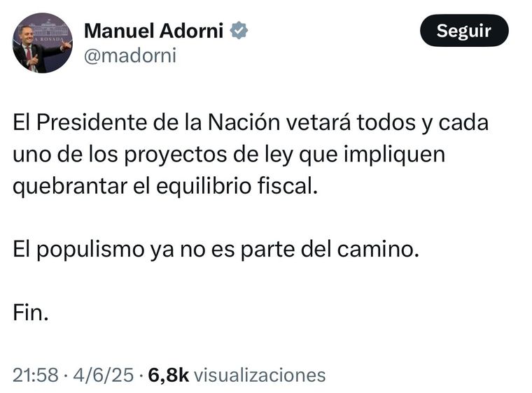 En sintonía con el líder libertario, el vocero presidencial Manuel Adorni salió a picantear en sus redes al afirmar que “el Presidente de la Nación vetará todos y cada uno de los proyectos de ley que impliquen quebrantar el equilibrio fiscal”.