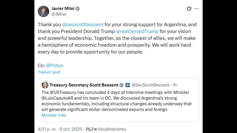 En principio, el mandatario expresó: "Gracias Scott Bessent por su firme apoyo a Argentina, y gracias al presidente Donald Trump por su visión y liderazgo firme". Tras esto, indicó: "Juntos, como aliados más cercanos, construiremos un hemisferio de libertad económica y prosperidad. Trabajaremos arduamente cada día para brindar oportunidades a nuestra gente".