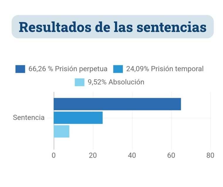 En los 58 juicios realizados hasta ahora, las sentencias han sido: el 66,26% prisión perpetua; el 24,09% prisión temporal y el 9,52% absolución. Es decir que la mayoría de los jurados, ha decidido una pena dura: la prisión perpetua.