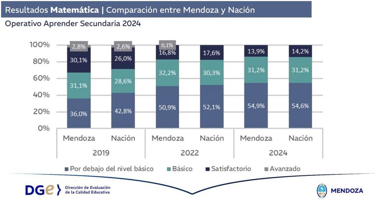 El desempeño en áreas críticas genera preocupación, pues denota que los alumnos no tuvieron un buen proceso: egresan con dificultades graves en matemáticas. Los resultados de las pruebas aprender generaron un impacto importante. En Mendoza no se ha logrado que el 54,9% de los alumnos del secundario superen los aprendizajes mínimos en matemática, según las pruebas Aprender y, además, hubo un retroceso marcado, pues en 2019 ese porcentaje (de alumnos “con mala nota”) era del 36% y en 2022, tras la pandemia, del 50%.