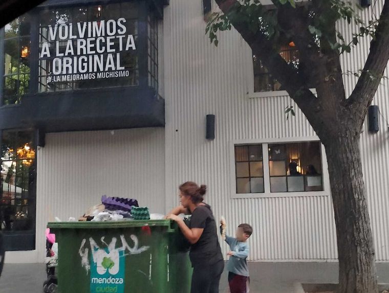 Sábado, mismo horario. Los contenedores están abiertos. Una mujer deja el changuito, mientras dos de sus hijos juegan a su alrededor. La mujer saca restos de alimentos y los reparte. El semáforo da el verde y los autos pasan rápido, mientras otros mendocinos y turistas cruzan caminando por la senda peatonal, a pocos metros de los contenedores verdes. La mujer y sus hijos siguen en la rutina de buscar comida entre los descartes del restaurante que está en la puerta. Lo que pueden, lo reciclan; si no, comen allí, obviando pudores.