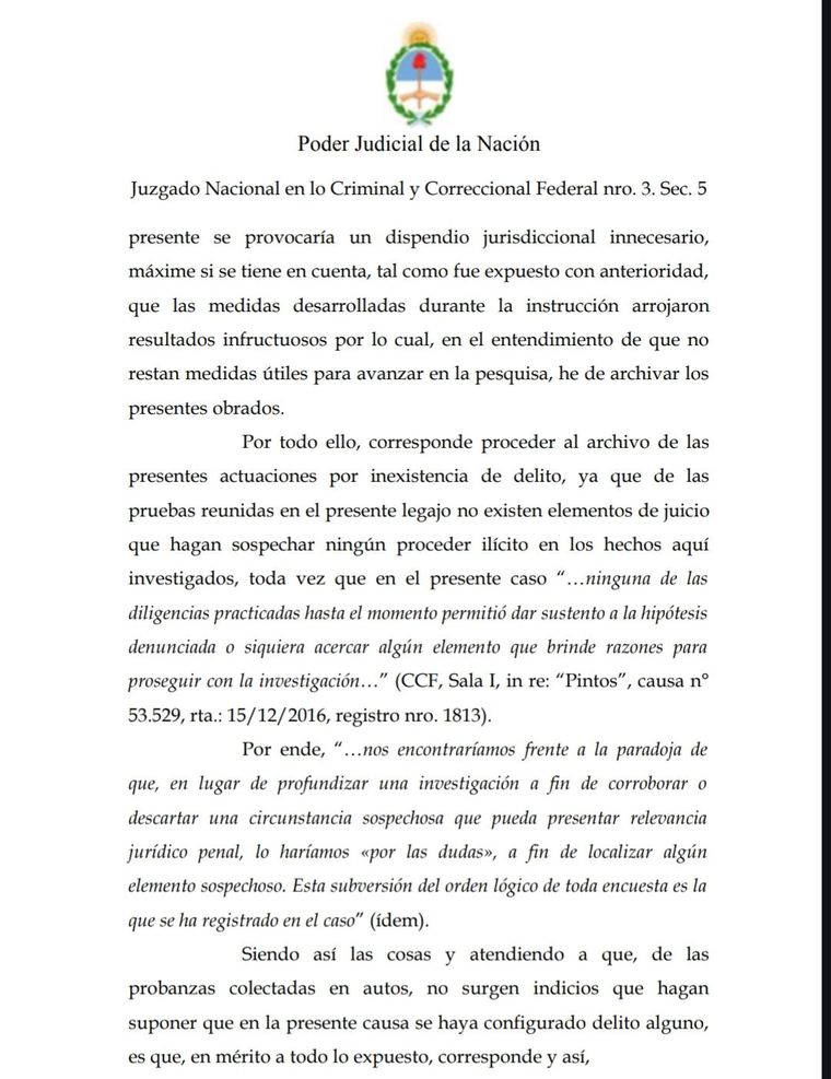 Según la resolución de 24 páginas a la que tuvo acceso MDZ, Rafecas consideró que no se logró corroborar ninguna de las maniobras ilícitas denunciadas por Bento.