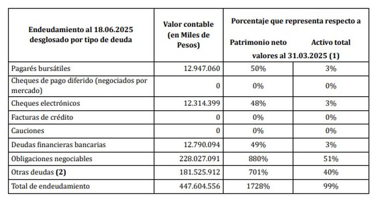 La deuda total de la empresa, según informó a la Comisión Nacional de Valores el viernes pasado, es de 447.604 millones de pesos, casi 400 millones de dólares. De esa deuda, 228.027 millones son por “obligaciones negociables”, es decir títulos que la empresa emitió en el mercado y que son las que dejó de pagar y ahora necesita refinanciar. El otro rubro que tiene un volumen grande está relacionado con la compra de activos petroleros a la empresa Vista, de Miguel Galuccio, deuda con proveedores y anticipos recibidos de clientes. “El pasivo total al 31 de marzo de 2025 ascendí a USD 395.923 mil (equivalentes a $425.221.296 mil). Al 18 de junio de 2025, el pasivo total asciende a USD 385.865 mil (equivalentes a $447.604.556 mil)”, indica el informe elevado a la CNV. Una de las urgencias es que de ese monto, casi 200 mil millones de pesos vencen a menos de un año de plazo.