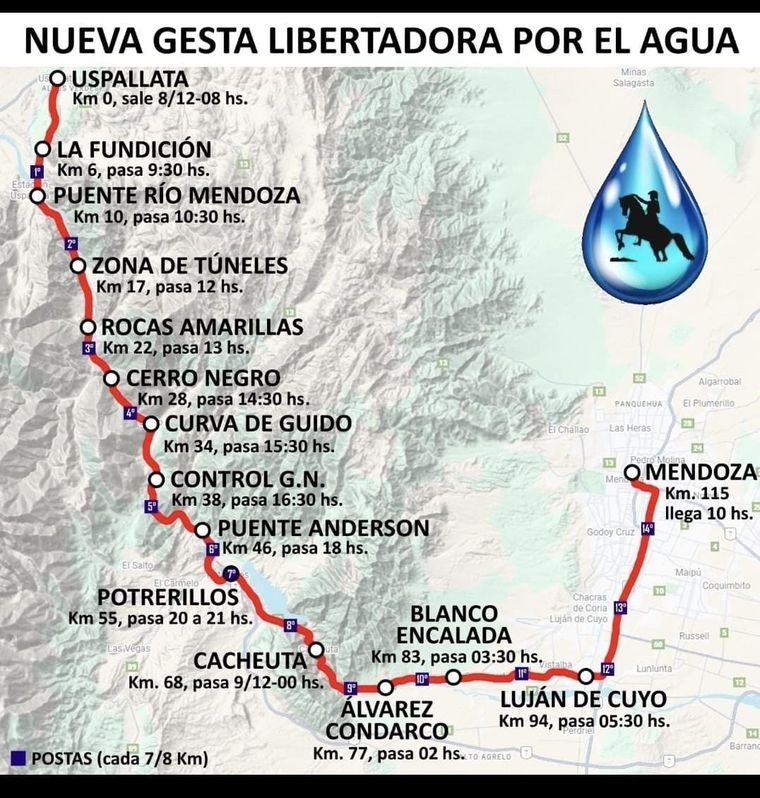 Se ha denominado por las asambleas "nueva gesta libertadora por el agua". Arranca en Uspallata, donde está previsto que opere San Jorge, extrayendo cobre y eventualmente oro, a las 8 de la mañana del lunes 8 que es feriado. La segunda parada es la Fundición, a las 12 pasa por la zona de Túneles y llegará a Potrerillos a las 20. Lo último que hará es llegar a la ciudad de Mendoza: quienes se movilicen arribarán a las 10 de la mañana del martes 9, a la sesión del Senado.