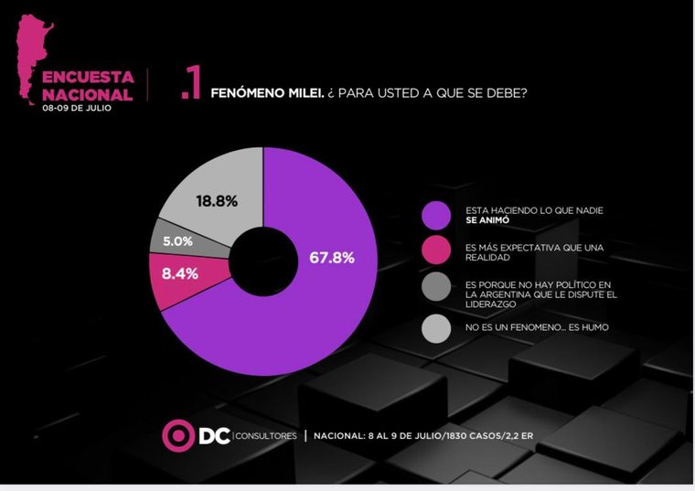 La primera pregunta de la encuesta de DC Consultores apunta a saber el porqué del fenómeno Javier Milei. El 67,8% de los consultados respondió que hace lo que nadie se animó; para el 18,8% es porque no hay un político que le dispute el liderazgo. Mientras que el 8,4% considera que es más una expectativa que una realidad; y para el 5% Milei es humo.