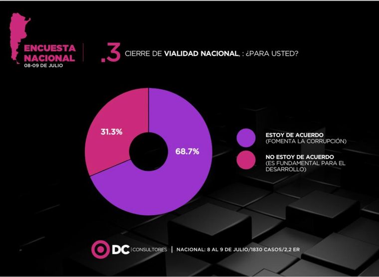 El cierre de Vialidad Nacional está presente en la encuesta. Para el 68,7% la medida tomada por Javier Milei es correcta, mientras que el 31,3 % la desaprueba.
