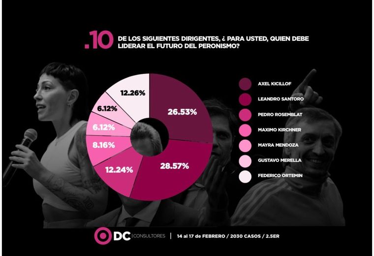 El 28,57 % cree que Leandro Santoro debe ser quién lidere en un futuro al peronismo; en segundo lugar, a 2 puntos de diferencia, se encuentra el gobernador de la provincia de Buenos Aires, Axel Kicillof y muy atrás de las preferencias se ubican Máximo Kirchner, Mayra Mendoza. Eso si el tercer lugar de los preferidos para manejar al peronismo se ubica el novio de “Lali”, Pedro Rosemblat