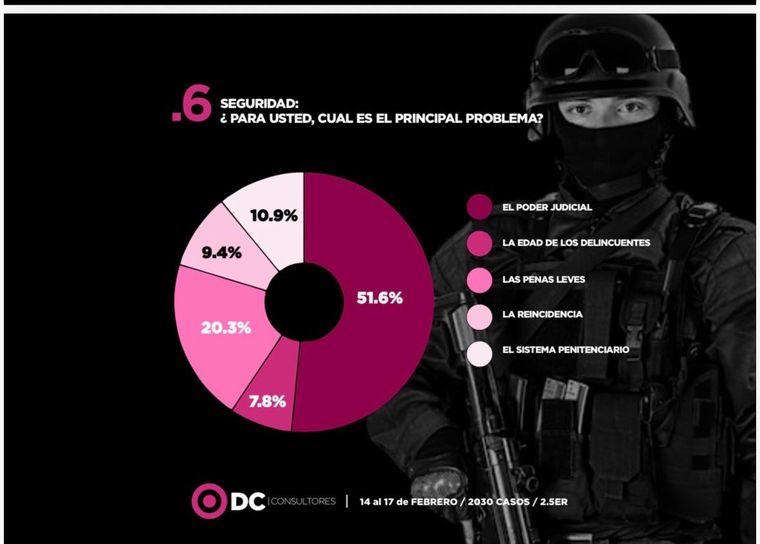 Como en todas las encuestas la inseguridad está presente. Pero en este sondeo buscaron saber cuál es el principal problema de la falta de seguridad; revelando algo que es vox populi, el accionar de la justicia. Para más del 50 % el poder judicial, es decir jueces y fiscales, son la principal causa de la inseguridad. Muy atrás quedaron la edad de los delincuentes y las penas leves.