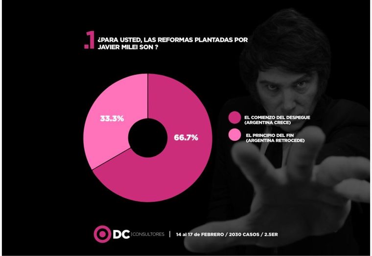 Para más del 66% de los encuestados es el comienzo del despegue para que Argentina empiece a crecer. Mientras que para el resto de los sondeados, un no despreciable 33,3%, Argentina retrocede y es el principio del fin.
