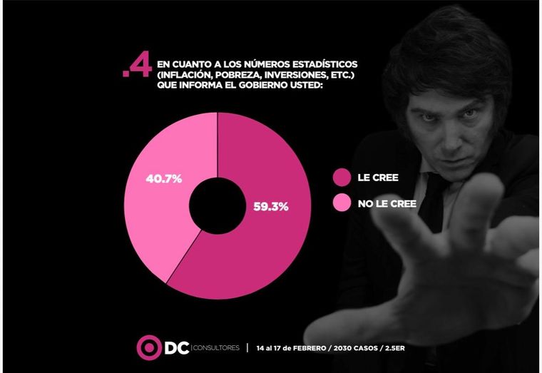 Esta parte de la encuesta vuelve a marcar la sintonía de la sociedad con Javier Milei. Ya que cerca del 60% cree en las estadísticas (inflación, pobreza, inversiones) difundidas por el gobierno nacional.