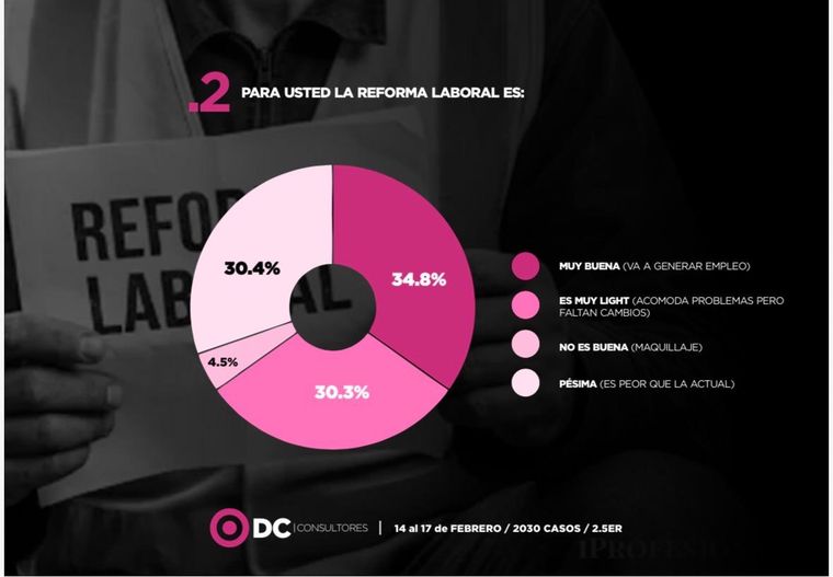 Otro punto de la encuesta de es sobre la reforma laboral. Ahí, si bien la aceptación es mayoritaria, los porcentajes encienden la primera “lucecita” que el gobierno debe prestarle atención.