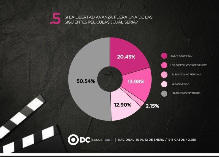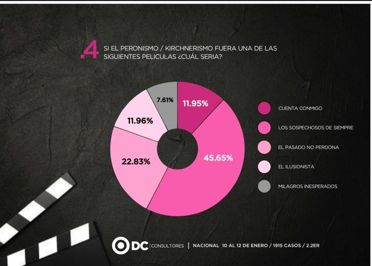 Una de las características distintivas que tiene la consultora dirigida por el politólogo Aníbal Uríos, son las preguntas disruptivas. En este caso le pidieron a los encuestados que elijan entre las siguientes cinco películas: “Cuenta conmigo”, “Los sospechosos de siempre”, “El pasado no perdona”, “El ilusionista” y “Milagros inesperados” para definir al peronismo/kirchnerismo y a La Libertad Avanza.