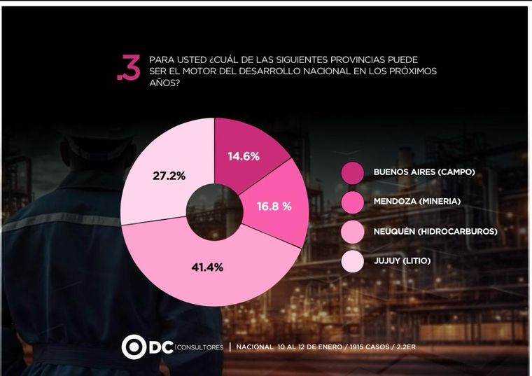 Los palmares se los llevo la provincia de Neuquén cosechando, gracias al yacimiento de Vaca Muerta, el 41,4% de las respuestas. Seguido por el litio jujeño con el 27,2% de las contestaciones. Mas atrás quedaron la industria minera de Mendoza (16,8%) y la actividad agrícola ganadera de la provincia de Buenos Aires (14,6%).