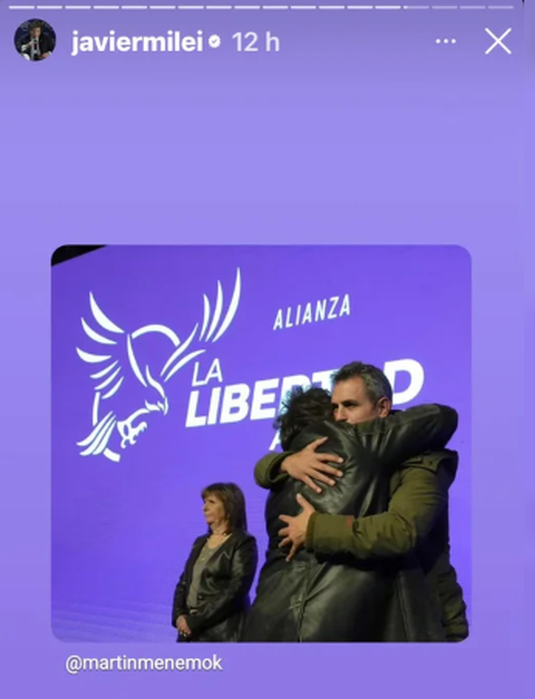 A través de su cuenta de Instagram, Javier Milei decidió dar por terminado el ruido interno al compartir una foto en sus historias que subió el propio Martín Menem. "Incondicional", expresó para describir el retrato del momento exacto en el que el presidente lo abrazó al subir al escenario para pronunciar el discurso final, luego de conocerse la abultada ventaja de 13 puntos que impuso a Fuerza Patria en la elección provincial.