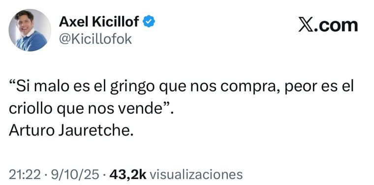 “‘Si malo es el gringo que nos compra, peor es el criollo que nos vende’, Arturo Jauretche” publicó Kicillof en su cuenta de X, a contramano del presidente Javier Milei y altos funcionarios del Gobierno, que celebraron la ayuda estadounidense.