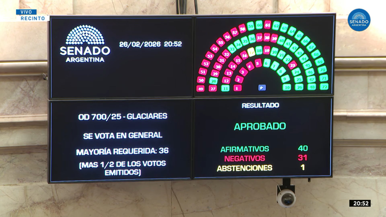 XDespués de cuatro horas de debate y en una sesión no excenta de polémicas, el Senado aprobó en general y en particular la reforma de la Ley de Glaciares (26.639) por 40 votos afirmativos, 31 negativos y una abstención. El proyecto, impulsado por el oficialismo, obtuvo media sanción y ahora deberá ser tratado por la Cámara de Diputados durante el período ordinario.