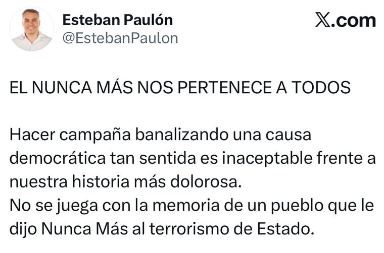 Por fuera del ala kirchnerista, el diputado nacional de Encuentro Federal, afirmó que la consigna del "Nunca Más" le pertenece "a todos". Sin embargo, cargó contra al oficialismo al apuntar que “hacer campaña banalizando una causa democrática tan sentida es inaceptable frente a nuestra historia más dolorosa”. Y cerró enfático: “No se juega con la memoria de un pueblo que le dijo Nunca Más al terrorismo de Estado”.