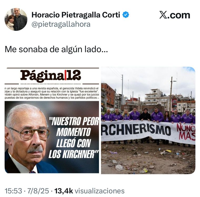 También se posicionó el exsecretario de Derechos Humanos e hijo de desaparecidos, Horacio Pietragalla Corti, quien posteó una foto del dictador Jorge Rafael Videla con una cita contra el kirchnerismo. “Me sonaba de algún lado…”, deslizó.