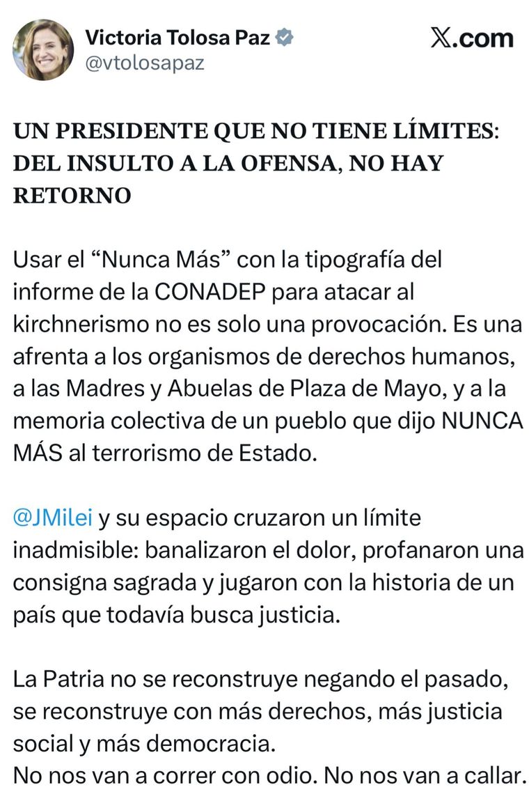 Una de las primeras en saltar fue la diputada nacional de Unión por la Patria, Victoria Tolosa Paz. Embroncada, apuntó que el uso de la frase no solo es una "provocación" hacia el kirchnerismo, sino que también "es una afrenta a los organismos de derechos humanos, a las Madres y Abuelas de Plaza de Mayo, y a la memoria colectiva de un pueblo que dijo Nunca Más al terrorismo de Estado".